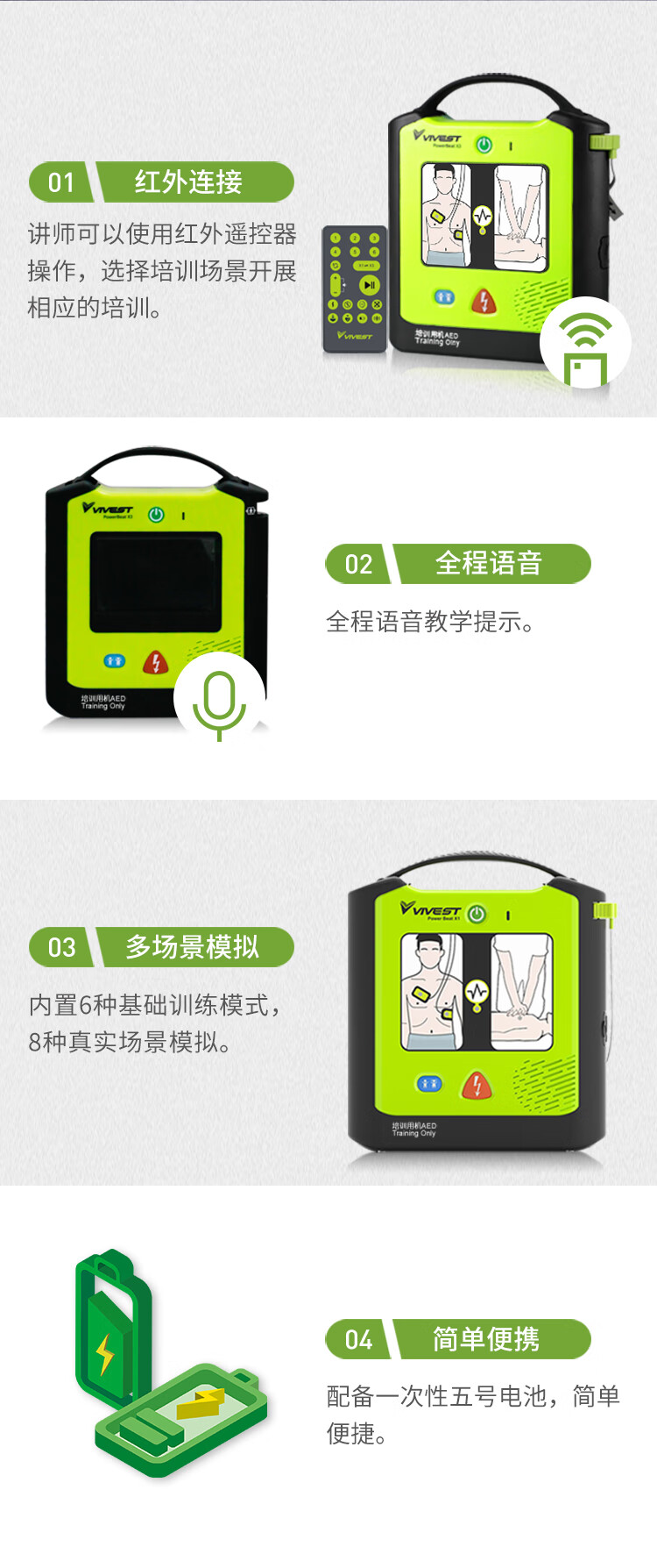 型号:PowerBeatX1Trainer, T1专为急救培训而设计,1:1模拟真机。该培训在培训指南、训练程序等方面完全模拟真实的AED,目的在于帮助急救人员熟悉AED,并掌握使用AED的必备基础操作技能。